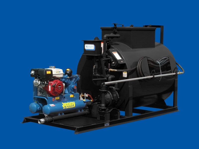 To achieve a low cost machine, we set out to build a small unit with an air pump and hand agitation. After selecting the best dual-diaphragm pump and air compressor, we put everything else we could fit. The result was the perfect machine for a beginner to start with, and the perfect complement to any large fleet of professional sealcoaters.